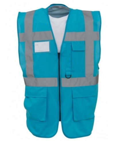 100% Polyester • Sicherheitsweste mit Reflektorstreifen quer und längs auf Vorder- und Rückseite • Schlüsselring und Sichtfenster für Namensschild auf der Vorderseite • Handytasche mit Klettverschluss, zwei Seitentaschen mit Klettverschluss • Praktischer Zip vorne • EN 471 Klasse 2.