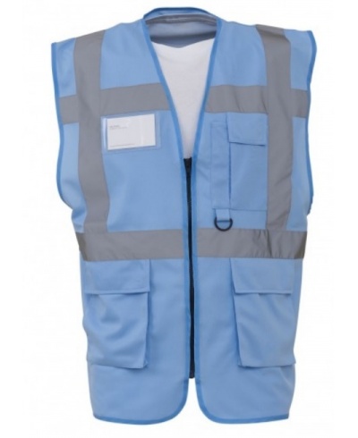 100% Polyester • Sicherheitsweste mit Reflektorstreifen quer und längs auf Vorder- und Rückseite • Schlüsselring und Sichtfenster für Namensschild auf der Vorderseite • Handytasche mit Klettverschluss, zwei Seitentaschen mit Klettverschluss • Praktischer Zip vorne • EN 471 Klasse 2.