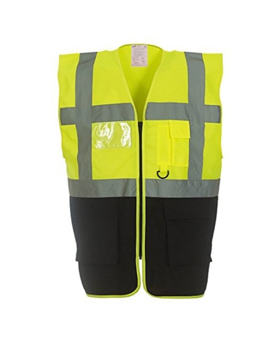 100% Polyester • Sicherheitsweste mit Reflektorstreifen quer und längs auf Vorder- und Rückseite • Schlüsselring und Sichtfenster für Namensschild auf der Vorderseite • Handytasche mit Klettverschluss, zwei Seitentaschen mit Klettverschluss • Praktischer Zip vorne • EN 471 Klasse 2.