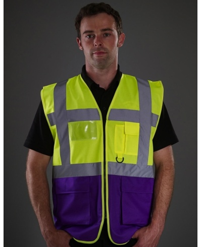 100% Polyester • Sicherheitsweste mit Reflektorstreifen quer und längs auf Vorder- und Rückseite • Schlüsselring und Sichtfenster für Namensschild auf der Vorderseite • Handytasche mit Klettverschluss, zwei Seitentaschen mit Klettverschluss • Praktischer Zip vorne • EN 471 Klasse 2.
