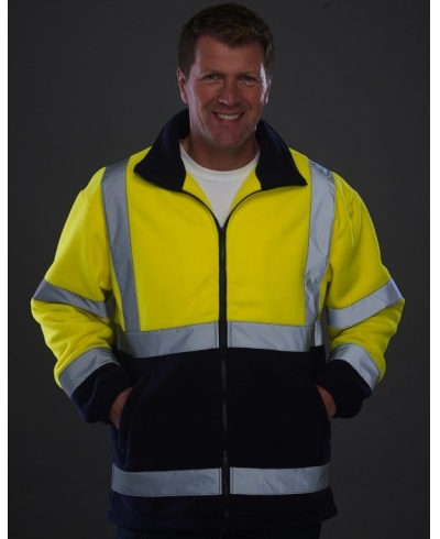 380 g/qm • 100% Polyester • Sicherheits-Fleecejacke mit 3M Reflektorstreifen quer und längs auf Vorder- und Rückseite • Stehkragen • Full Zip • Elastische Ärmelbündchen • Seitentaschen mit Zip • EN 471 Klasse 3.