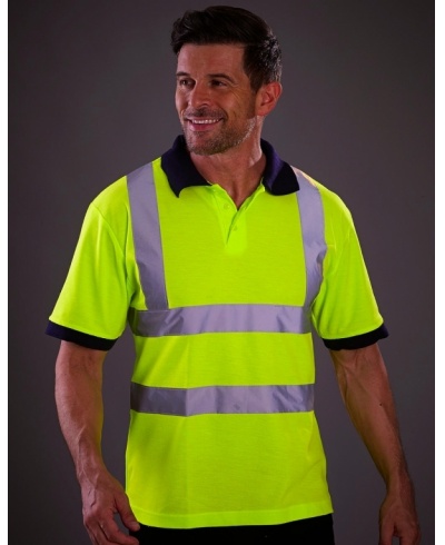 100% Polyester • Sicherheitspolo mit 3M Reflektorstreifen quer und längs auf Vorder- und Rückseite • Nackenband • 3er Knopfleiste mit Ton-in-Ton Knöpfen • Kragen und Ärmelabschluss mit Rippstrickbündchen in Navy • Doppelnaht am Bund • EN 471 Klasse 2.