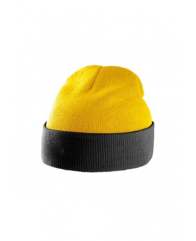 100% Acryl. Modische Mütze mit gestricktem Umschlag in Kontrastfarbe.