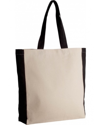 Geräumige Tasche aus 310 g/m² Baumwollcanvas mit Seitenfalte und kontrastfarbenen Tragegriffen. Fassungsvermögen: 15 L.